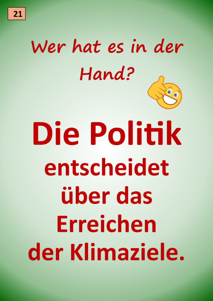 „Die Klima-Governance beruht auf politischen Entscheidungen. Die Wirksamkeit der Klimaschutzmaßnahmen hängt von vier Schlüsselelementen ab: Ausweitung der Klimapolitik, klimafreundliche Governance-Modelle, ein erweiterter Instrumentenmix sowie die Unterstützung durch Politik und Gesellschaft.“ (D.25)